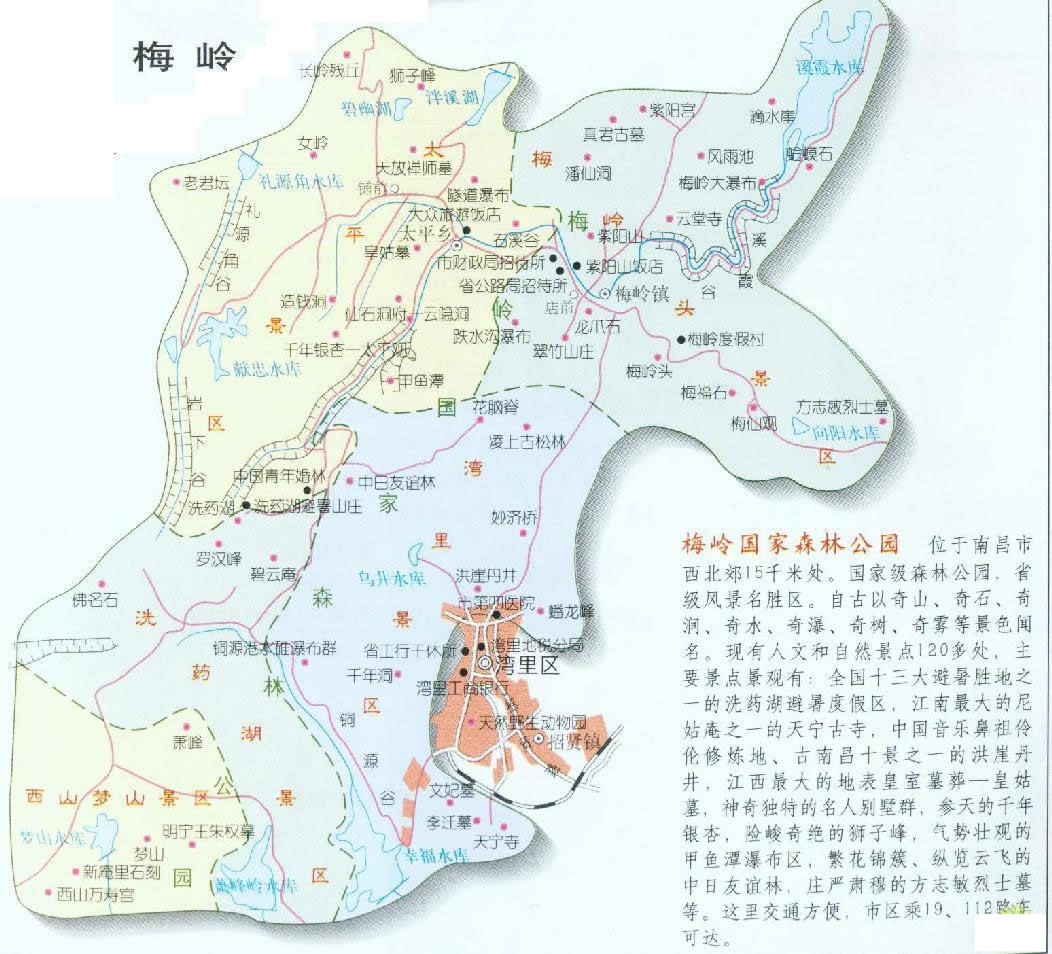 梅嶺有自然和人文景點(diǎn) 120多處,主要景觀有:被稱為全國第十三大避暑勝地之一的洗藥湖避暑度假區(qū)、江南最大尼姑庵之一的天寧古寺、中國音樂鼻祖伶?zhèn)愋逕挼、古南昌十景之一的洪崖丹井、江西最大的地表皇室墓葬──皇姑墓、神奇?dú)特的名人別墅群、參天的千年銀杏、峻險(xiǎn)奇絕的獅子峰、氣勢壯觀的腳魚潭瀑布區(qū)、繁花錦簇、縱覽云飛的中日友誼林、莊嚴(yán)肅穆的方志敏烈士墓等。