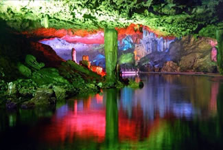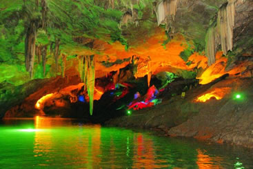 通往水洞的碼頭,千余平方米的水面,宛如一幽靜別致的“港灣”,燈光所及,水中游船、洞中石景倒映其中,使人如入仙境。從護(hù)岸石階拾級而下,通過長廊從碼頭上船,即可暢游水洞。水洞全長5800米,現(xiàn)已開發(fā)2800米,面積3.6萬平方米,空間40余萬立方米,最開闊處高38米,寬70米。