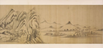 董其昌仿米黃山水圖卷:明晚期,絹本。用筆參以披麻與米點(diǎn)皴法,為其自家面貌。卷后部行書(shū)自題:“家有黃子久《富春大嶺圖》、米元暉《瀟湘圖》,和會(huì)兩家筆意為此卷,大都子久畫(huà)出于巨然與海岳父子同參也。”后署款:“董玄宰識(shí)”,下鈐“知制誥日講官”、“董其昌印”白文印二方?顐(cè)鈐“楨父審定”、“墨緣堂來(lái)氏收藏書(shū)畫(huà)記”二印。