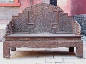 保極宮內(nèi)正中暖軒上方,高懸嘉慶御筆“高林萬(wàn)象”匾,意思是皇帝居于萬(wàn)物之上,在暖軒中央設(shè)龍紋明黃坐具一副,清帝東巡時(shí),就在此召見(jiàn)親近王公。清代題材影視劇中的召見(jiàn)場(chǎng)面,皇帝與大臣往往光頭、便服,其實(shí)這在清代是絕對(duì)不允許的。大臣覲見(jiàn)須著常服補(bǔ)褂朝珠,戴紅纓官帽;实垡彩浅7酃又。常服是皇帝在宮中正式場(chǎng)合所穿禮服,用為處理一般政務(wù)或召見(jiàn)大臣。官員亦如是,按清制穿錯(cuò)朝服最輕也要罰俸一月,因?yàn)檫@是清代制度所嚴(yán)格規(guī)定的,即以天子之尊,亦不能違背。值得一提的是,暖軒黃座兩旁各有一個(gè)紫檀高柜,象征著皇帝身份的高貴至尊。在皇帝寢宮里的柜子從不裝滿(mǎn)東西,意味富貴有余,寢宮的的床又長(zhǎng)又窄意味著長(zhǎng)壽,而枕頭特別高,意味著高枕無(wú)憂(yōu)。