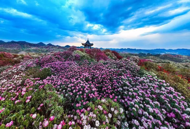 百里杜鵑景區(qū),位于貴州省西北部,貴州省畢節(jié)市大方縣、黔西縣交界處,是全國最大的杜鵑花景區(qū)。百里杜鵑實為一座規(guī)模宏偉的天然花園,以天然的杜鵑花海而得名。又因以大面積原生杜鵑林為主要特色,杜鵑林帶寬1~3千米,綿延50余千米,綿延百里,故稱“百里杜鵑”。被譽為“世界上最大的天然花園”,享有“地球彩帶、世界花園”之美譽。百里杜鵑風(fēng)景名勝區(qū)總面積約為125.8平方公里。 主要著名景區(qū)有普底景區(qū)、金坡景區(qū)、野營區(qū)、游樂區(qū)、休閑療養(yǎng)區(qū)、后備發(fā)展區(qū)等,杜鵑花主要分布在普底景區(qū),包括馬纓杜鵑、大白花杜鵑、水紅杜鵑、露珠杜鵑、露珠杜鵑、團花杜鵑等多達41個品種的杜鵑花,囊括了世界杜鵑花5個亞屬的全部,貴州70余種的二分之一多,花色多樣。每年的3月底-4月末是百里杜鵑風(fēng)景名勝區(qū)的最佳花期,也是最適合參觀的時間節(jié)點。在7月初-8月末又是百里杜鵑風(fēng)景名勝區(qū)的最佳避暑時間節(jié)點。