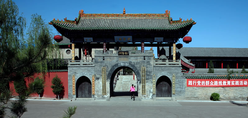 孝義市三皇廟,亦稱圣祖廟,位于孝義市城西賈家莊村中,F(xiàn)存建筑最早為元代遺構(gòu)。元、明、清和民國年間曾不同程度進行擴建和修葺。該廟南北寬59米,東西長84米,兩進院布局。遒勁有力的“三皇廟”鑲嵌在山門的門額上。中軸線建有樂樓、三皇殿。頭院空闊,北角設(shè)磚券山門,二進院北角設(shè)掖門為一、二進院出入通道。兩進院落自然地平落差較大,故掖門前設(shè)踏步緩解。三皇殿坐西向東,面闊三間,進深四架椽,梁架為三椽,前壓搭牽用三柱,單檐硬山頂前廊式。三皇殿內(nèi)仍保存元代結(jié)構(gòu)。三皇殿門上方掛有匾額,書寫“三皇廟”為明萬歷十年十月四川按察使梁明翰贈。殿內(nèi)正面供奉太昊伏羲、神農(nóng)炎帝、軒轅黃帝,兩側(cè)配祀古代十大名醫(yī),山墻繪有“行醫(yī)圖”壁畫,壁畫色彩明艷,線條清晰。大殿對面樂樓坐東向西,面闊三間,進深五架椽,單檐卷棚頂。前后臺隔架和頂棚全為彩畫木式組成,臺口四周有木、磚、石雕刻清代遺構(gòu)。臺口上方高懸民國八年所刻匾額一塊,上書“海市蜃樓”,由晚清書法名家秦龍光所書。樂樓藻井彩繪梁山好漢一百零八將,神彩各異,栩栩如生。前后臺間,鑲嵌大塊玻璃為整座戲臺增光添彩,時有“玻璃戲臺”的美譽,曾形成邑內(nèi)外“為看戲臺而看戲”的時尚。