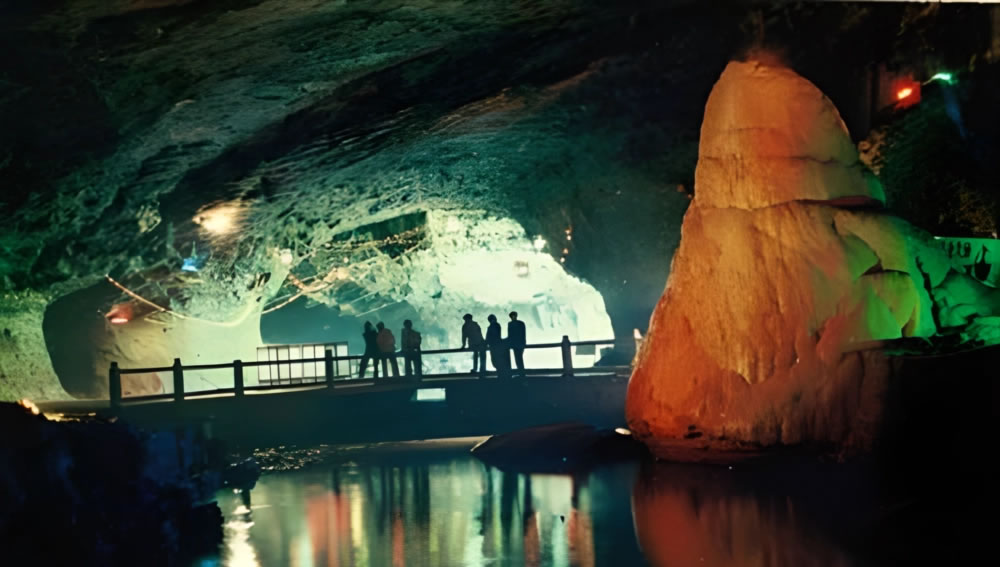 • 洞內(nèi)有中國最大的地下河,全長400米,水深1-10米,可容納萬余人。