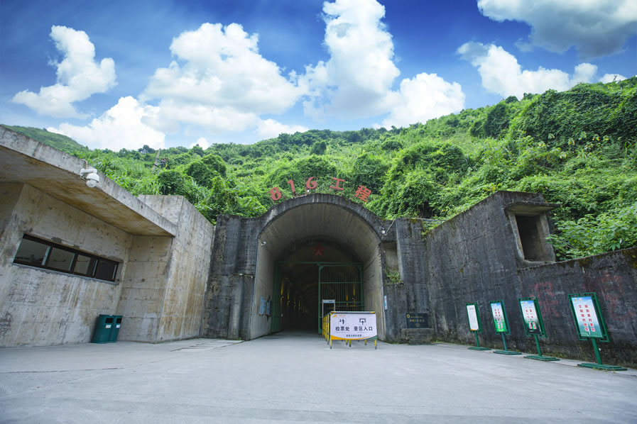 重慶816工程遺址,位于重慶市涪陵區(qū)白濤街道,緊鄰烏江,背靠武陵山。1966年由中央軍委、周恩來總理批準(zhǔn)建設(shè),該工程打山洞用時8年,安裝設(shè)備用時9年,總投資7.46億元人民幣。先后投入6萬多人參與建設(shè),工程歷經(jīng)急建、緩建、停建和轉(zhuǎn)產(chǎn)4個階段,1984年因國家戰(zhàn)略調(diào)整,工程停建。2002年國防科工委同意對816工程解密。816工程遺址軸向疊加全長20余千米,完全隱藏在山體內(nèi)部,洞內(nèi)冬暖夏涼,四季恒溫。總建筑面積10.4萬平方米,主洞室高達79.6米,拱頂跨高31.2米,洞內(nèi)有大型洞室18個,道路、導(dǎo)洞、支洞、隧道及豎井130多條,建筑布局宛如迷宮,洞中有洞,洞中有樓,樓中有洞。