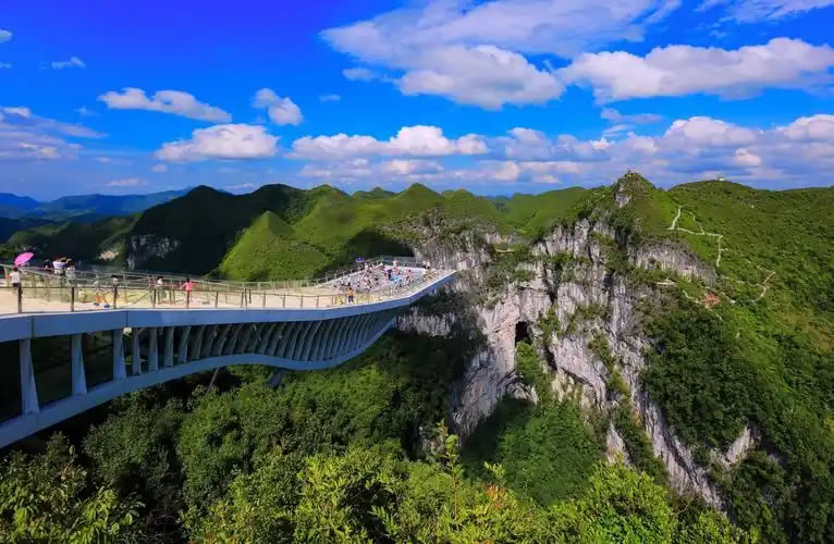 2. 云海天舟:世界最長懸挑玻璃觀景平臺,懸空258米,晴天可見彩虹橫跨天坑,陰天云霧繚繞似仙境。