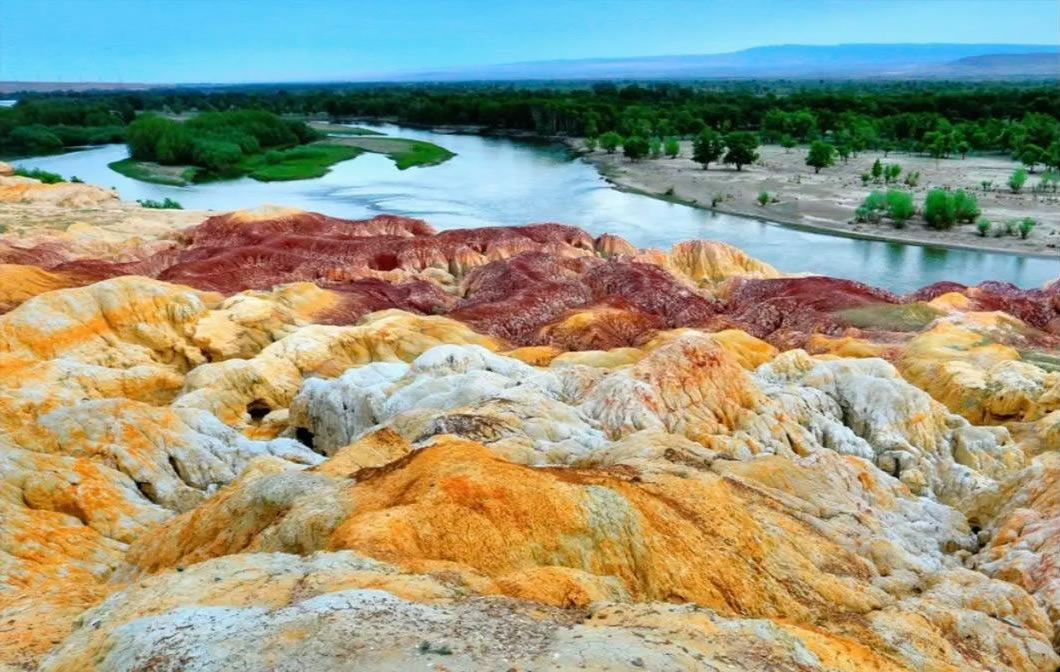 • 特色:以“一河隔兩岸”奇觀聞名——北岸雅丹地貌色彩斑斕(紅/綠/紫/黃/棕),南岸河谷綠洲森林茂密,額爾齊斯河穿流其間,形成“半邊火焰半邊森林”的魔幻畫(huà)面。