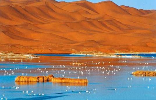 當?shù)啬撩穹Q之為“月亮湖”、“中國湖”,因為該湖從東邊看好像一輪彎彎的月亮靜靜地傾訴著古老的故事,從西邊沙丘上看好像一幅中國地圖,氣勢磅礴。