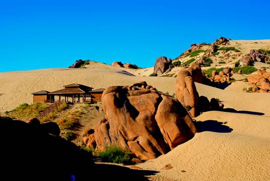 赤峰市西拉沐淪河兩岸,是著名的科爾沁沙地的組成部分,有“八百里瀚!敝Q。翁牛特旗的其甘、布日敦、勃隆克山等地,是典型的科爾沁沙地發(fā)育區(qū)。到此旅游,既可以一睹“長(zhǎng)河落日?qǐng)A,大漠孤煙直”的沙漠風(fēng)采,又可以體味沙漠與綠洲、湖泊相生相伴的沙地獨(dú)特景觀。