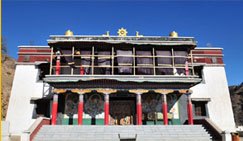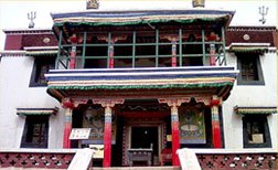 喇彌仁殿(菩提道學(xué)經(jīng)堂),又稱日木倫殿。建于光緒十八年(1892年),位于護(hù)法殿后邊西北高聳的山坡上,為教義戒律學(xué)部,這個(gè)學(xué)部在內(nèi)蒙地區(qū)藏傳佛教寺院中只有五當(dāng)召設(shè)立。是召廟建筑群中建造年代最晚的建筑物。殿內(nèi)正中供奉銅鑄高九米的黃教創(chuàng)始人宗喀巴坐像。左右兩側(cè)塑其兩大弟子嘉曹杰和克珠杰塑像。兩側(cè)木龕內(nèi)有一千尊一模而成的宗喀巴塑像。二樓凸起的天窗既可容納高大的塑像,又可采納光線,顯示了獨(dú)具匠心的藏傳佛教寺廟建筑特點(diǎn)。