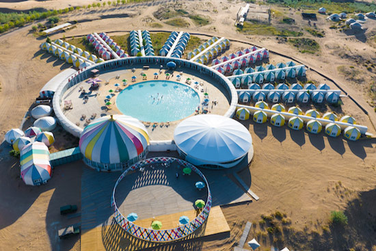 一粒沙度假村與沙漠各島隔河相望,于罕臺(tái)河?xùn)|岸半山腰,河水從它的門(mén)前流過(guò),對(duì)岸是茫茫沙海,在這里體驗(yàn)水上瑜伽,水中健身操或參加游泳比賽。
