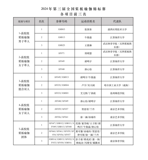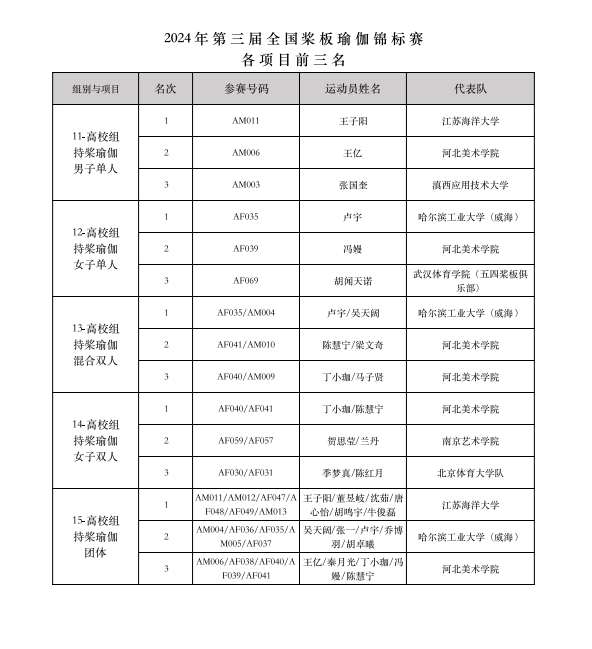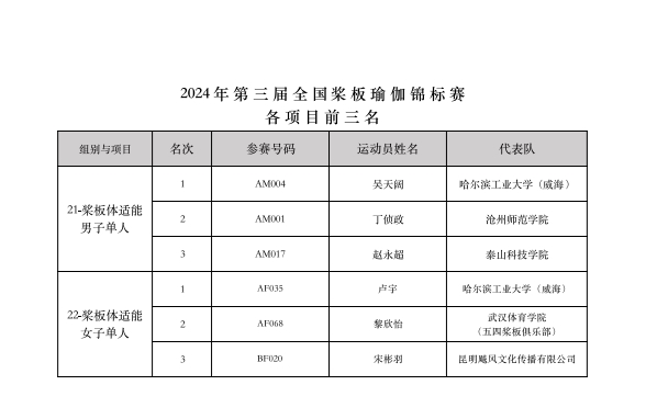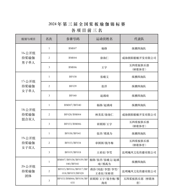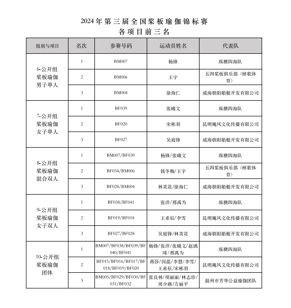 最終經(jīng)過為期兩天的激烈競賽,“意爾康杯”2024年第三屆全國槳板瑜伽錦標(biāo)賽共決出槳板瑜伽、持槳瑜伽、槳板體適能等3大類共22項(xiàng)比賽各項(xiàng)前三名的獲獎名次。