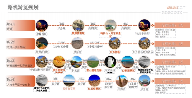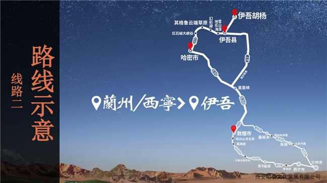 其中線路一“絲路雙珠風情環(huán)線”主題為”“千年敦煌·萬年胡楊”——敦煌至伊吾的奇幻之旅。自南一路向北,跨越敦煌、哈密、伊吾,連接甘肅、新疆兩地,全程路線大約640公里。