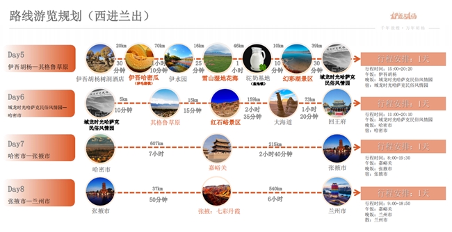 沿途景點涵蓋了蘭州、張掖七彩丹霞、嘉峪關關城、敦煌莫高窟、敦煌鳴沙山月牙泉景區(qū)、星星峽、伊吾胡楊景區(qū)、伊吾哈密瓜(淖毛湖鎮(zhèn))、伊水園、伊吾雪山濕地花海、伊吾駝奶基地(鹽池鎮(zhèn))、伊吾幻彩湖景區(qū)、伊吾齊格魯草原、伊吾紅石峪景區(qū)、哈密大海道、回王府、大柴旦翡翠湖、茶卡鹽湖、青海湖、西寧。