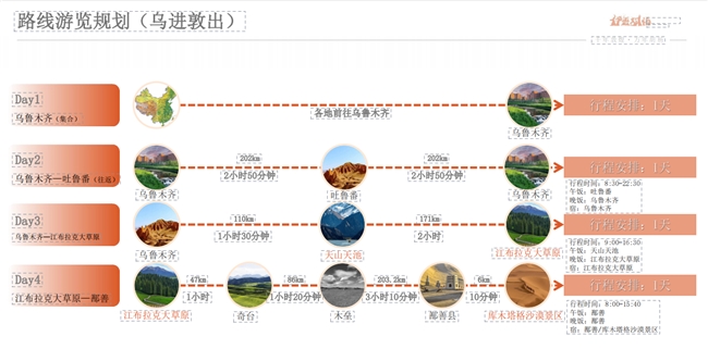 沿途景點為烏魯木齊、吐魯番火焰山、昌吉州天山山池、昌吉州江布拉克大草原、奇臺、木壘、善庫木塔格沙漠景區(qū)、了墩、哈密大海道、伊吾齊格魯草原、伊吾幻彩湖景區(qū)、伊吾胡楊景區(qū)、星星峽、敦煌莫高窟、敦煌鳴沙山月牙泉景區(qū)、敦煌市。