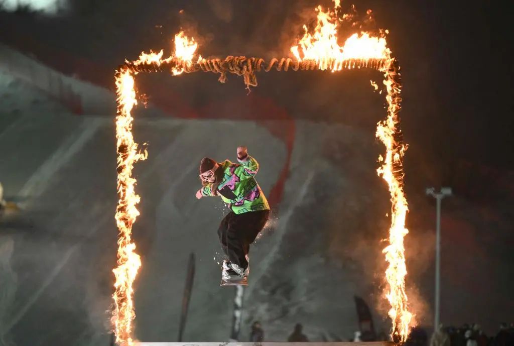1月29日,雪友在新疆將軍山國際滑雪度假區(qū)新春趣味滑雪公園跳臺(tái)活動(dòng)上鉆過火圈。新華社記者胡虎虎 攝