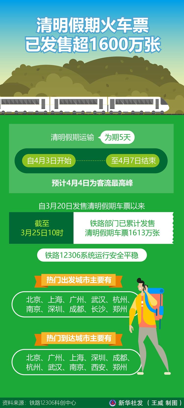 記者25日從鐵路12306科創(chuàng)中心獲悉,清明假期運(yùn)輸自4月3日開(kāi)始,至4月7日結(jié)束,為期5天,預(yù)計(jì)4月4日為客流最高峰。自3月20日發(fā)售清明假期車(chē)票以來(lái),截至3月25日10時(shí),鐵路部門(mén)已累計(jì)發(fā)售清明假期車(chē)票1613萬(wàn)張,鐵路12306系統(tǒng)運(yùn)行安全平穩(wěn)。