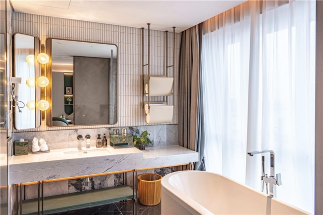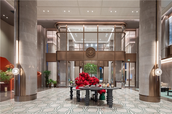 酒店由法國設(shè)計師Jave操刀設(shè)計,以"楚韻新譯"為理念,巧妙融合現(xiàn)代奢華元素與荊楚文化傳統(tǒng)特色,打造出既具時代風(fēng)尚又飽含文化底蘊(yùn)的獨特空間。大堂主體采用大面積玻璃幕墻,搭配莫蘭迪紅綠配色點綴,白天,陽光透過玻璃傾灑,大堂內(nèi)溫馨明亮,宛如璀璨水晶宮殿;夜晚,借助精妙燈光設(shè)計,呈現(xiàn)出迷人光影效果,成為城市夜色中耀眼的明珠。