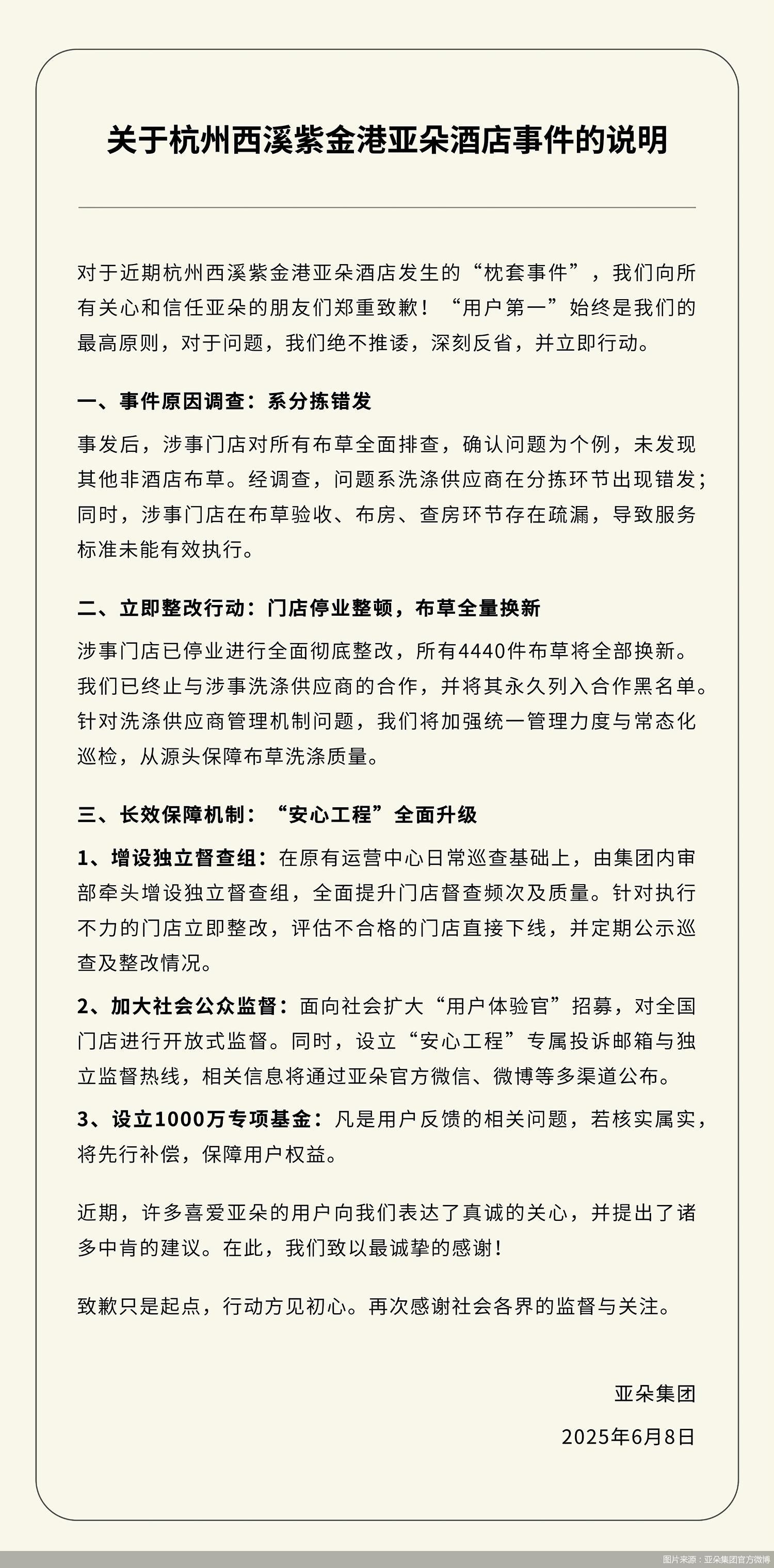 6月8日,據(jù)“亞朵集團”官方微博消息,亞朵集團發(fā)布關于杭州西溪紫金港亞朵酒店事件的說明,對于近期杭州西溪紫金港亞朵酒店發(fā)生的“枕套事件”,亞朵集團向所有關心和信任亞朵的朋友們鄭重致歉。事發(fā)后,涉事門店對所有布草全面排查,確認問題為個例,未發(fā)現(xiàn)其他非酒店布草。經調查,問題系洗滌供應商在分揀環(huán)節(jié)出現(xiàn)錯發(fā);同時,涉事門店在布草驗收、布房、查房環(huán)節(jié)存在疏漏,導致服務標準未能有效執(zhí)行。