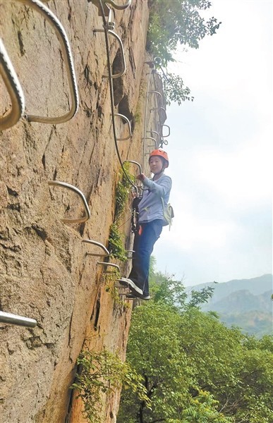 崔女士熱愛徒步,這次是跟隨徒步群一起參加飛拉達體驗活動。她記得,剛剛站上幾米高的巖壁回頭望下去時,心里還是“咯噔”了一下,有些發(fā)怵。“剛開始要調(diào)兩個鐵扣時我有些慌,越慌越怕,后來操作熟了,發(fā)現(xiàn)始終有一個扣子在鋼絲上,安全感一下子就上來了。”