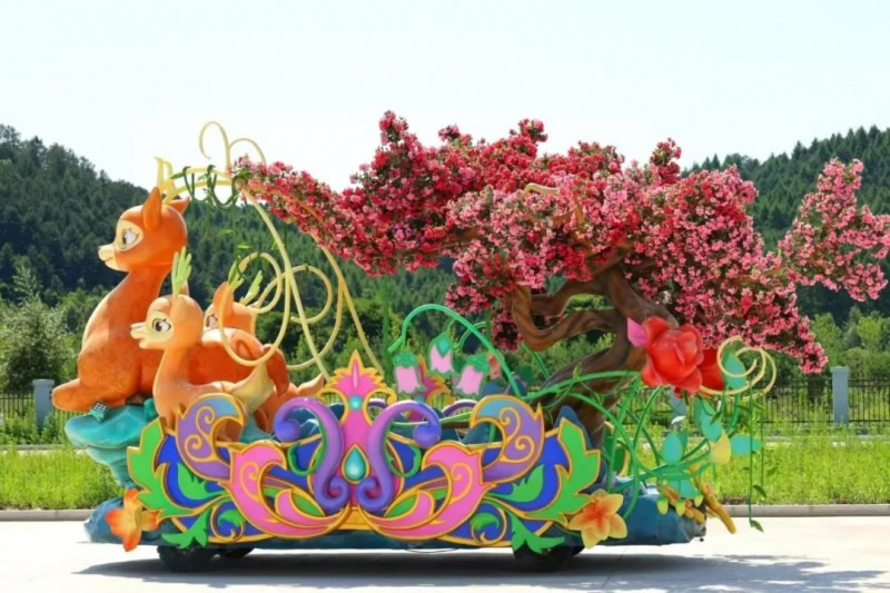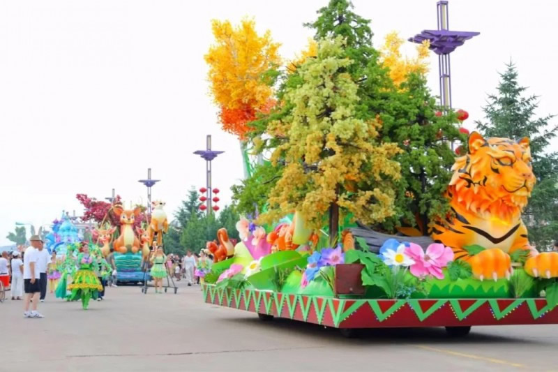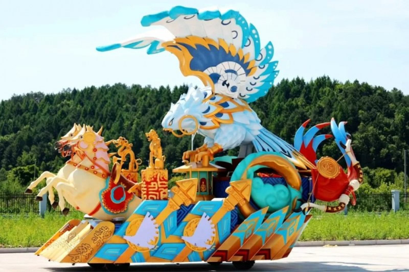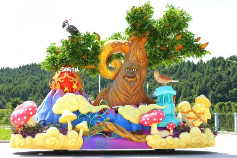 花車設(shè)計不僅注重視覺沖擊力,更融入動態(tài)特效:虎頭擺動、翅膀扇動、雪花機噴灑等細(xì)節(jié),讓靜態(tài)的造型煥發(fā)生命力。夜幕降臨時,花車更以夜光效果點亮林海,為觀眾呈現(xiàn)一場光影交織的奇幻盛宴。