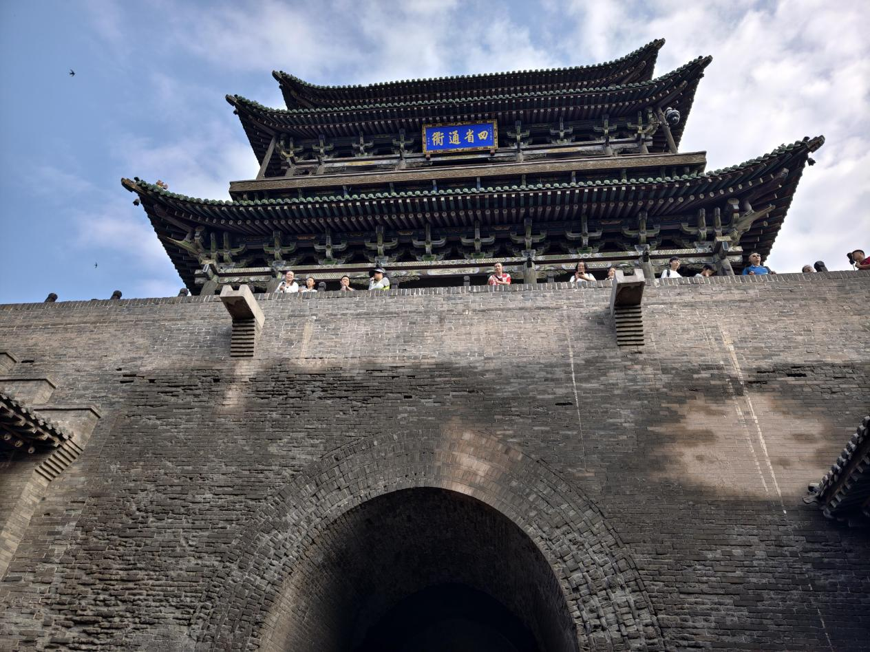 登上古城墻遠(yuǎn)眺,6000多米長的城墻巍峨挺拔。據(jù)工作人員介紹,現(xiàn)在我們看到的城墻基本上保留了明代的建筑形制,外墻包磚內(nèi)墻夯土。古城內(nèi)以南大街為軸線,四大街、八小巷、七十二條蚰蜒巷縱橫交錯(cuò),民居、客棧、票號(hào)、鏢局等呈東西對稱分布。青磚路面以及上面深深的古車轍印,是古城“四省通衢”的重要見證。