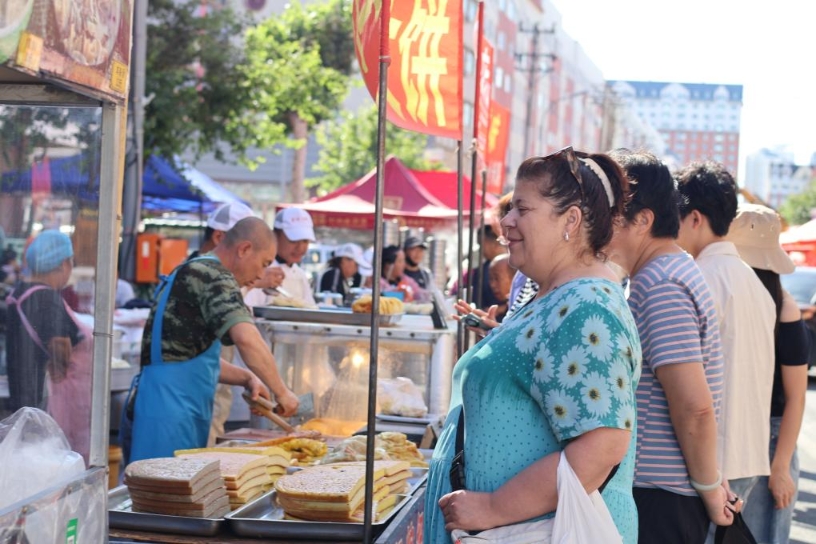 這是俄羅斯游客黑河早市選購(gòu)早餐(7月8日攝)。新華社 記者 姜思妮 攝