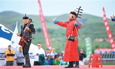 演員在內(nèi)蒙古自治區(qū)第十一屆少數(shù)民族傳統(tǒng)體育運(yùn)動(dòng)會(huì)(巴林右旗分賽場(chǎng))開賽儀式上表演。