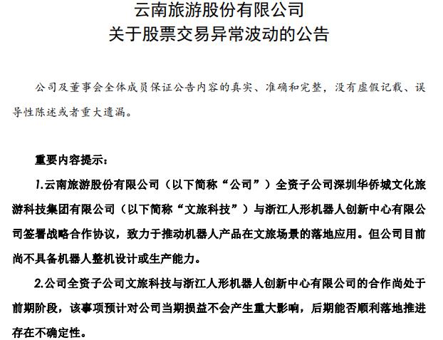 根據(jù)云南旅游22日盤后發(fā)布的異動公告,目前,雙方合作尚處于前期階段,該事項預(yù)計對公司當期損益不會產(chǎn)生重大影響,后期能否順利落地推進存在不確定性。另外,公司目前尚不具備機器人整機設(shè)計或生產(chǎn)能力。