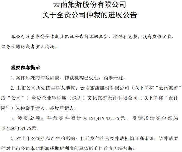 公司在今年2月發(fā)布公告,海力控股集團有限公司與公司的全資公司云南旅游汽車有限公司所屬全資公司云南云旅交通投資開發(fā)有限公司發(fā)生合同履行糾紛,海力控股就該合同糾紛向昆明市中級人民法院提起訴訟。因云旅交投認為海力控股存在違約,對案件提起反訴。近日,公司收到昆明中院出具的《民事判決書》,判決由云南云旅交通投資開發(fā)有限公司支付海力控股集團有限公司工程款1.18億元及預(yù)期利息等。