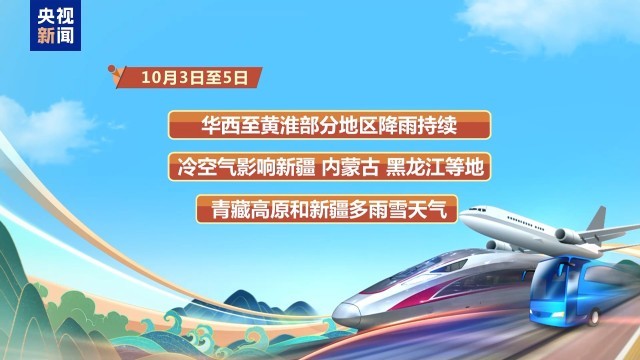 據(jù)中央氣象臺發(fā)布的消息,10月3日至5日,華西至黃淮一帶部分地區(qū)降雨持續(xù),冷空氣影響我國新疆、內(nèi)蒙古、黑龍江等地,青藏高原和新疆多雨雪天氣。公安部交通管理局提醒廣大駕駛?cè)撕统鲂腥罕,注意關注沿途及目的地氣象部門預報預警信息。