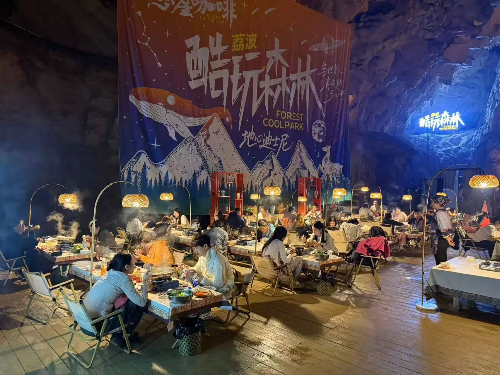 探險(xiǎn)之后,在常年保持15攝氏度的洞穴餐廳,吃上一頓熱氣騰騰的火鍋,感受與洞外溫差帶來(lái)的獨(dú)特體感,成為游客們的特別享受。開闊的洞廳內(nèi),數(shù)十張餐桌整齊排列,餐桌上方的暖色照明燈既保證了用餐所需的足夠亮度,又完整保留了洞穴的自然氛圍。游客們一邊圍坐火鍋旁大快朵頤,一邊欣賞巖壁上自然形成的奇異紋路,感受這個(gè)地下空間獨(dú)有的神秘。