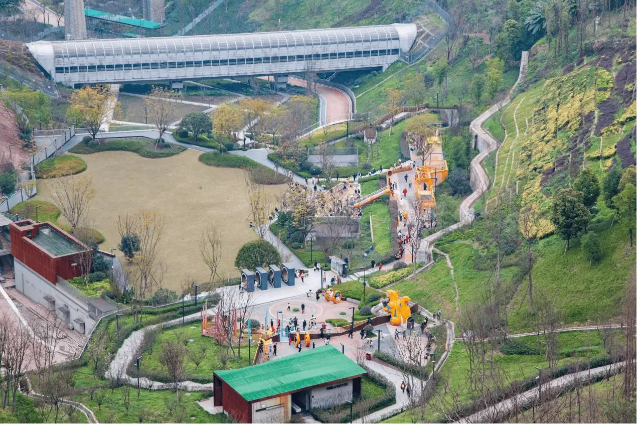 依山就勢(shì),渝中區(qū)推進(jìn)21萬(wàn)平方米坡坎崖由“禿斑”變“綠毯”、由“荒地”變“游園”、由“治理點(diǎn)”變“打卡點(diǎn)”。實(shí)現(xiàn)了鵝嶺—虎頭巖10.8公里山脊線(xiàn)綠蔭如蓋,長(zhǎng)江、嘉陵江11.5公里濱水綠帶織綠成廊。渝中在紅巖公園充分利用“漏斗”地形,擋墻加固崖壁緩坡,生態(tài)復(fù)綠4.35萬(wàn)平方米,中間平坦區(qū)域開(kāi)辟為兒童樂(lè)園,入選全國(guó)兒童友好空間典型案例。