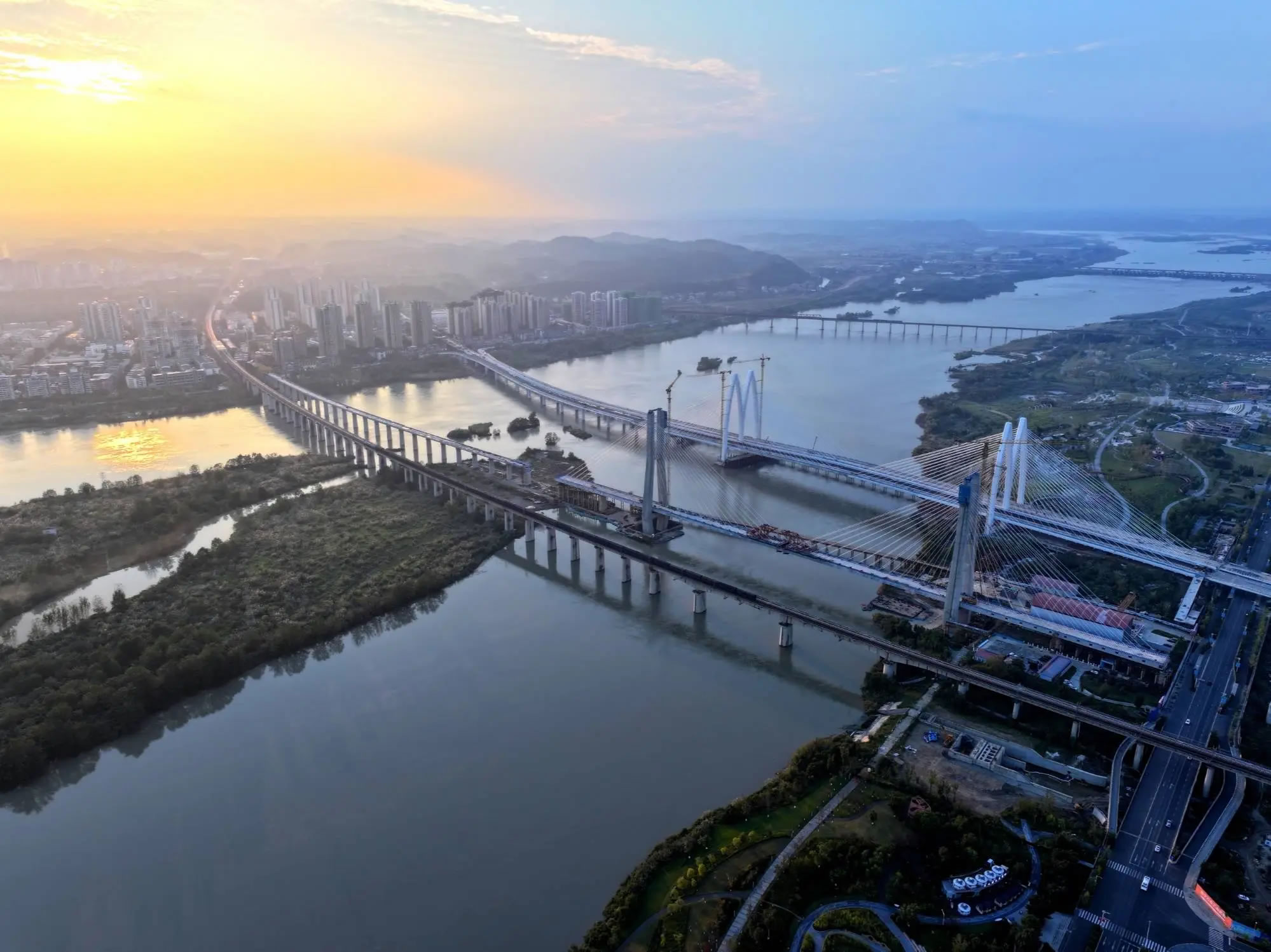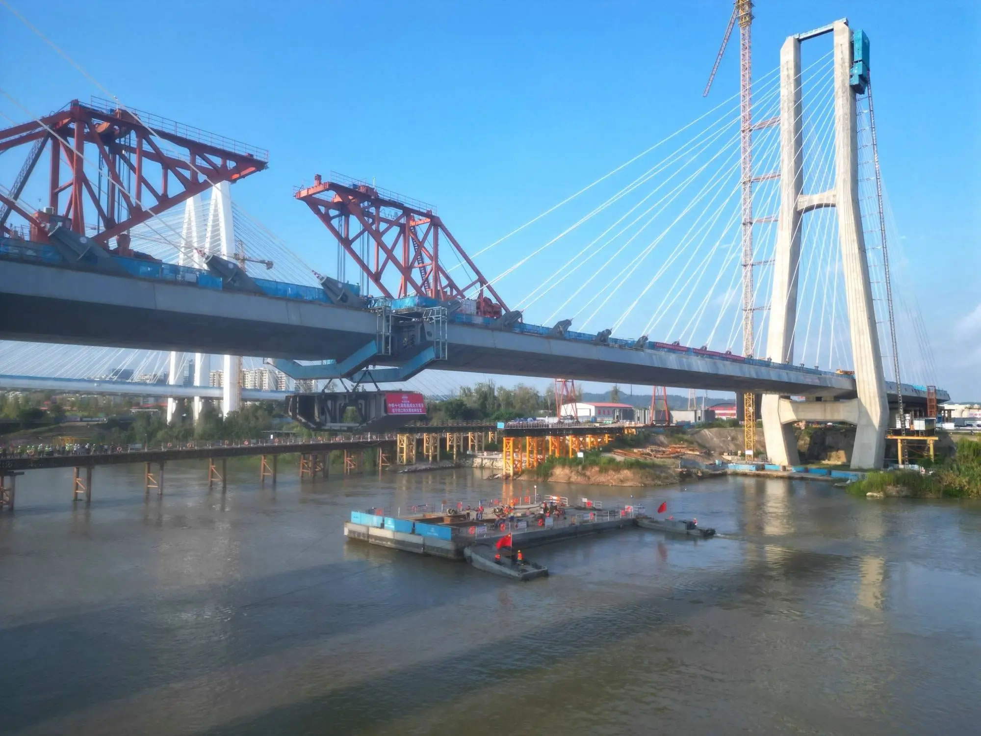 據(jù)中鐵十七局成達萬高鐵項目二工區(qū)總工程師單立國介紹,由于大橋橫跨涪江,施工團隊創(chuàng)新采用“浮運+橋面吊裝”方案,先將鋼箱梁通過浮箱從碼頭運輸至江心指定位置,再運用150噸橋面吊機進行精準(zhǔn)提升。為確保合龍精準(zhǔn)可控,項目團隊提前謀劃、周密部署。針對大跨度斜拉橋合龍段受力復(fù)雜、溫度變形敏感、精度控制要求高等技術(shù)難點,團隊選擇夜間“溫度低、溫差小”時段進行合龍,有效減少溫度變化引起的結(jié)構(gòu)變形,并通過線形監(jiān)控、勁性鎖定等關(guān)鍵技術(shù)措施,最終將線形精度控制在毫米級范圍,實現(xiàn)高質(zhì)量合龍。