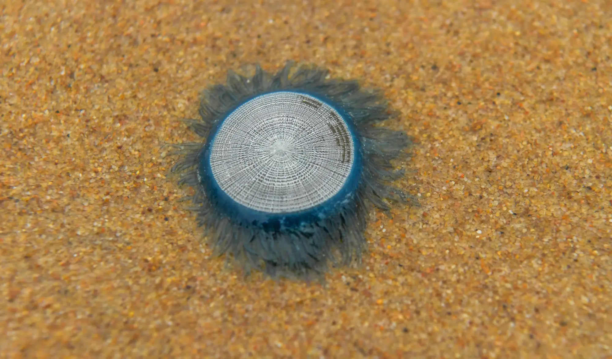 經(jīng)?谑匈Y規(guī)局聯(lián)同海南省海洋監(jiān)測(cè)預(yù)報(bào)中心專家取樣鑒定,這些圓形藍(lán)色生物為銀幣水母,其浮囊體硬而透明,質(zhì)輕呈圓盤狀,觸手上有刺絲囊,毒性相對(duì)較弱。該物種自身無(wú)游泳能力,其移動(dòng)完全依賴海流驅(qū)動(dòng),本次銀幣水母上岸原因,或是受臺(tái)風(fēng)“風(fēng)神”影響,被強(qiáng)風(fēng)和大浪推上海岸。