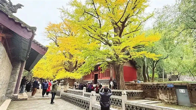 據(jù)工作人員介紹,這兩株枝干相依的古銀杏不僅是“資深網紅”,更是承載歷史的“活文物”。它們歷經500年風雨,至今枝繁葉茂,每年深秋都會如期換上“黃金盛裝”,與圣母殿、魚沼飛梁等著名古建筑共同構成一幅動人的秋日畫卷。