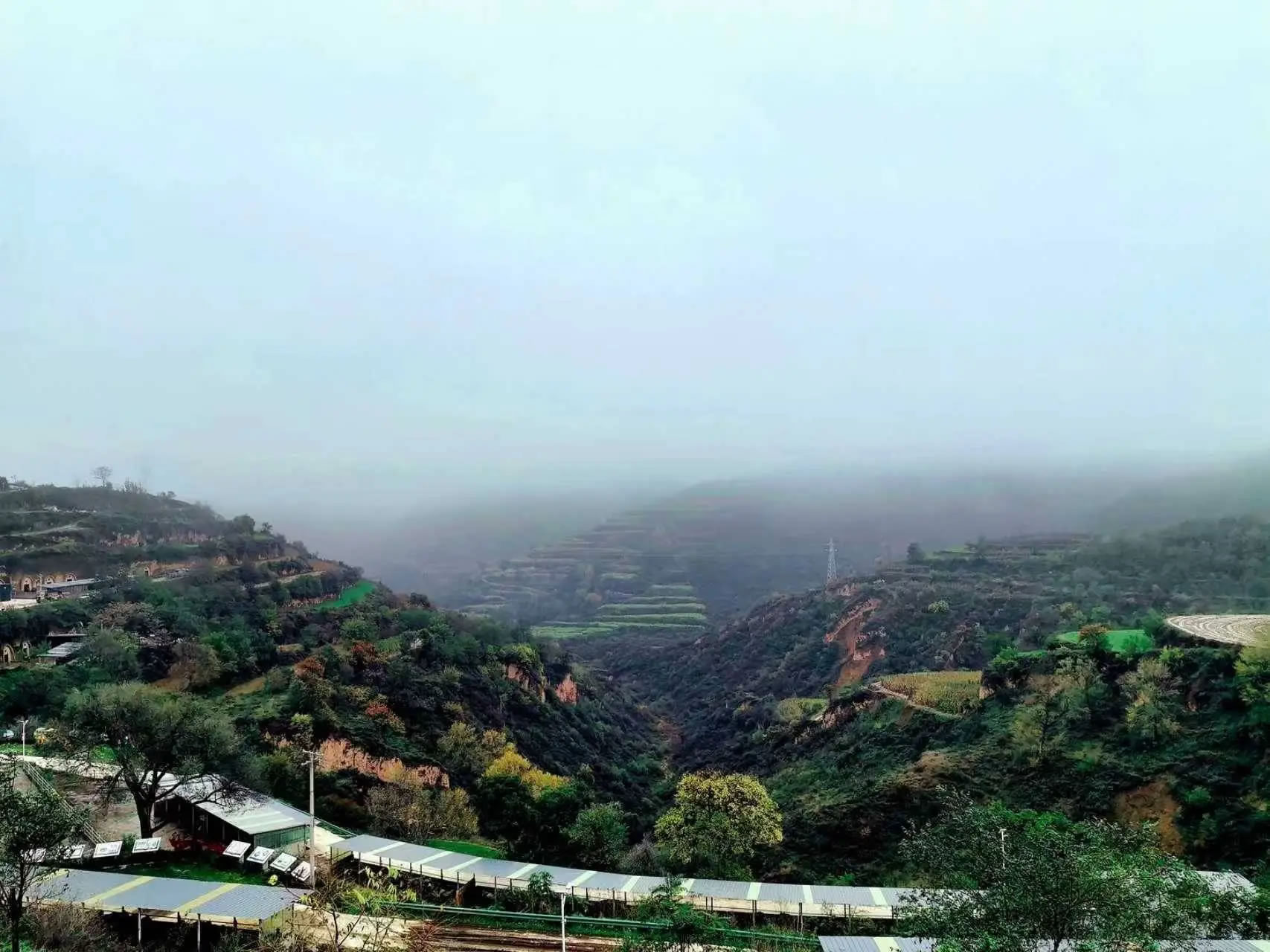 大寨鄉(xiāng)海拔1540米、北緯35.38度,屬溫帶半干旱氣候,四季分明、風(fēng)景宜人,豐富的水資源和廣袤的植被共同構(gòu)筑了獨(dú)特的局部小氣候,使得大寨鄉(xiāng)在降雨之后,常常云霧繚繞。如紗的霧氣縈繞于山巒溝壑之間,將遠(yuǎn)山近樹渲染成一幅流動(dòng)的水墨畫。