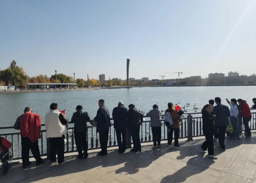 10月28日,在杜鵑河彭加木雕像水域附近,成群的天鵝和野鴨等鳥(niǎo)類在河面上游弋、嬉戲,潔白的天鵝與碧水、藍(lán)天、樓宇相映成趣,美輪美奐,吸引了不少市民和游客駐足欣賞,構(gòu)成一幅自然和諧的生動(dòng)畫(huà)卷。重慶游客張清揚(yáng)說(shuō):“第一次來(lái)到庫(kù)爾勒,看到美麗的天鵝,心情都被治愈了,這是大自然的饋贈(zèng),庫(kù)爾勒的自然環(huán)境好,才會(huì)吸引這么多天鵝來(lái)這里過(guò)冬。”