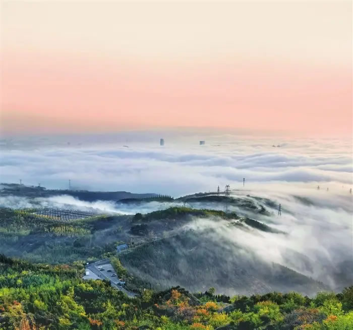 清晨6時(shí)許,市民高勁鵬與朋友驅(qū)車前往西山萬(wàn)畝生態(tài)園。沿途霧氣彌漫,山路蜿蜒間,紅黃綠相間的植被頻頻躍入眼簾,偶有靈動(dòng)的松鼠從山路旁躥出又疾速消失在馬路對(duì)面,遠(yuǎn)處山巒影影綽綽,“人在畫中游”的韻味十足。汽車快抵達(dá)山頂時(shí),眼前的濃霧突然消散,淡藍(lán)色天空下,云海如流水般在城市上空鋪開(kāi)。遠(yuǎn)處,云層翻涌似海浪;近處,沿山霧帶若玉帶流動(dòng),高壓電線塔頂端與零星高樓在霧中時(shí)隱時(shí)現(xiàn)。