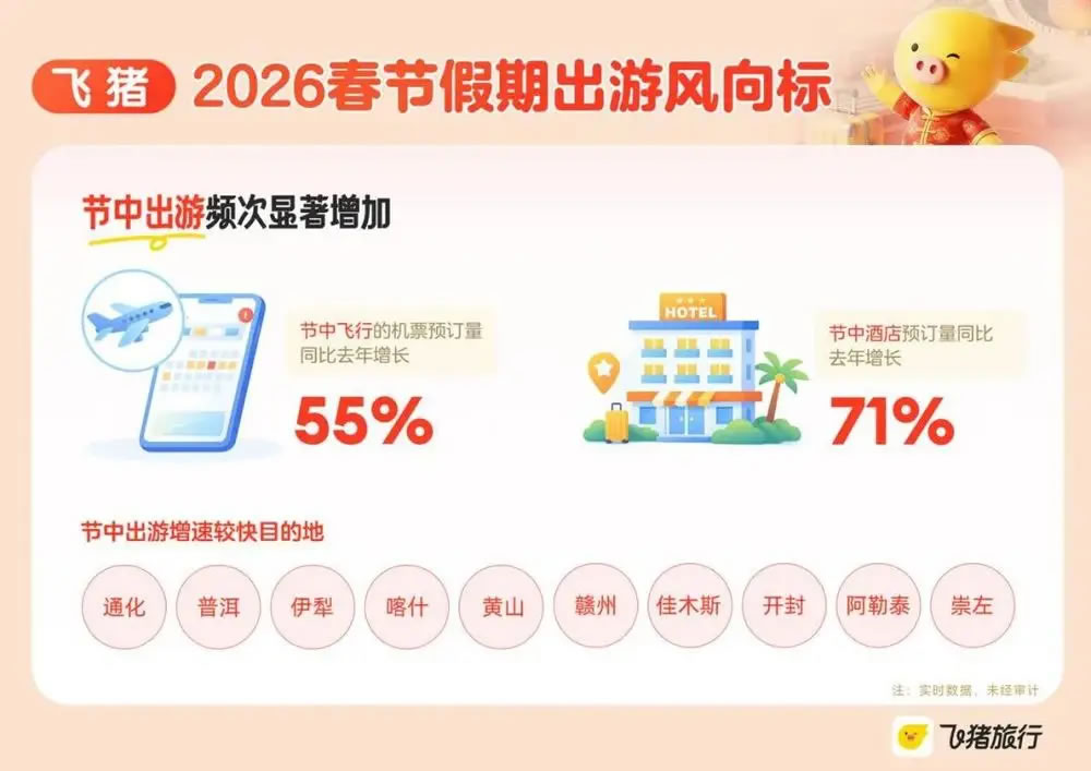 游客節(jié)中最愛去哪里?據(jù)飛豬觀察,長線的“3小時飛行圈”和短線的“2小時自駕圈”特征明顯,前者集中于一二線城市周邊300公里內(nèi)的寶藏小城,后者集中于西南、西北、東北等典型的旅游城市。從目的地來看,通化、普洱、伊犁、喀什、黃山、贛州、佳木斯、開封、阿勒泰、崇左等城市的節(jié)中出游預訂增速較快。
