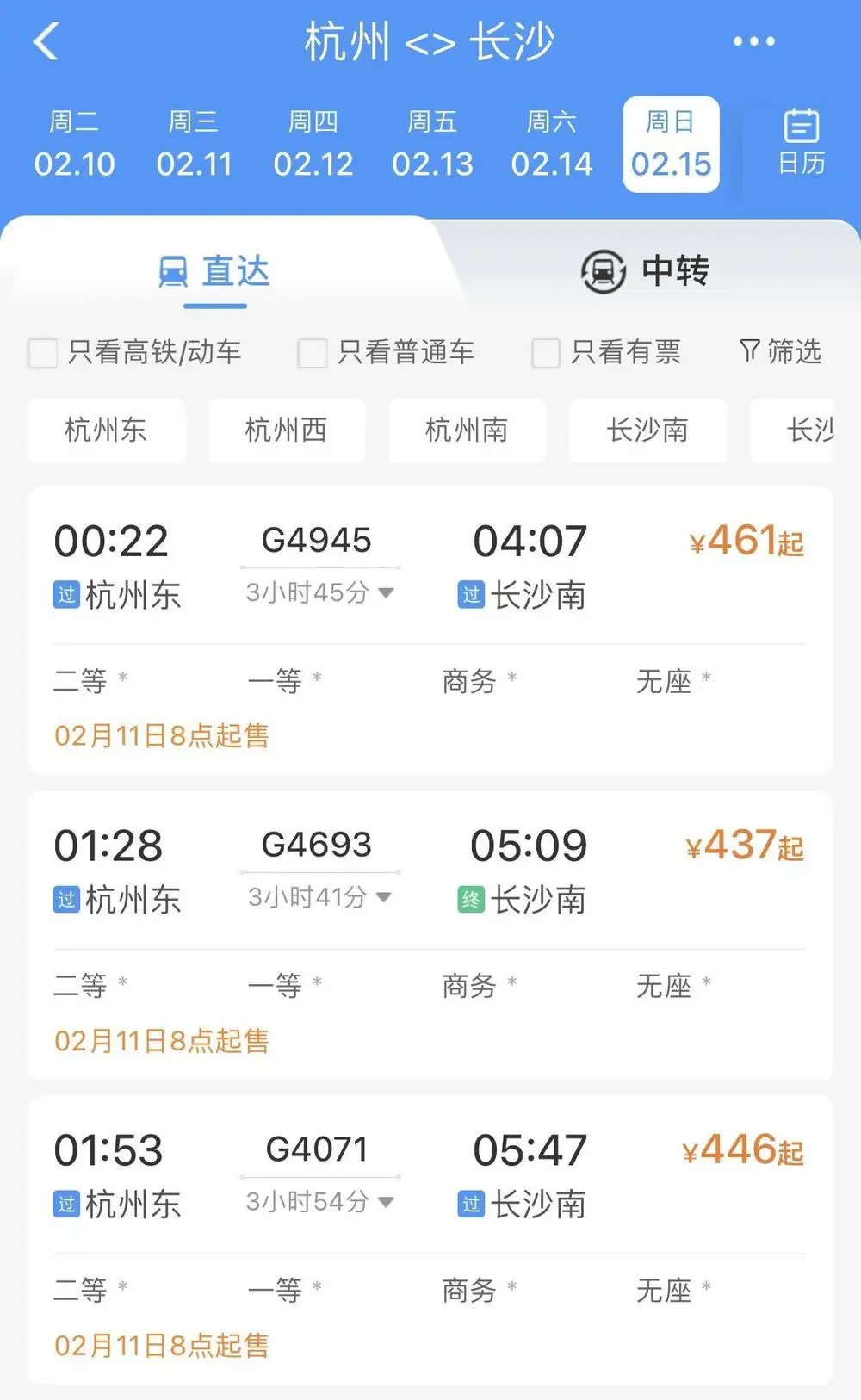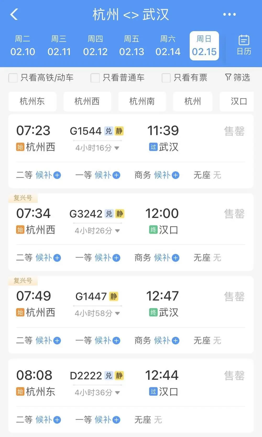 比如,2月15日杭州前往武漢、長沙、南昌、貴陽等地,無論是普速列車還是動車組列車,當天所有車次已經基本全部售罄,只剩極個別車次硬座、無座席位還有余票。