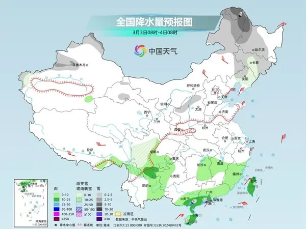 中國(guó)天氣網(wǎng)訊 今天(3月2日),中東部降水將有所減少減弱,但江南、華南等地仍有較大范圍降雨,強(qiáng)降雨分布較零散。受冷空氣和陰雨雪共同影響,本周北方多地氣溫波動(dòng)明顯,華北一帶體感濕冷,公眾外出需添衣保暖。