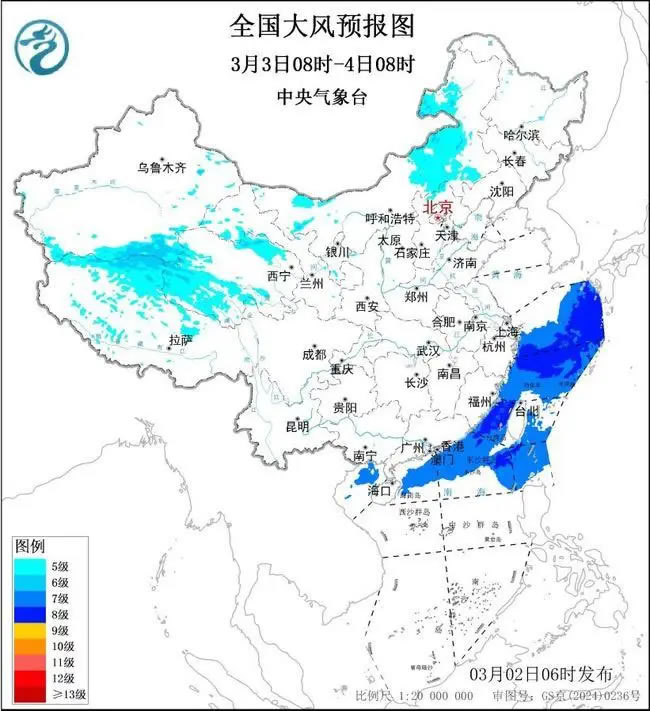 預(yù)計,3月2日08時至3日08時,新疆東部、西藏中西部、青海北部、內(nèi)蒙古大部、江蘇東部等地將有5~6級、陣風(fēng)7~8級的大風(fēng);黃海中部和南部海域、東海大部海域、臺灣海峽、臺灣以東洋面、南海東北部偏北海域?qū)⒂?~8級、陣風(fēng)9級的大風(fēng),其中黃海東南部海域、東海北部海域風(fēng)力可達9~10級、陣風(fēng)11級。