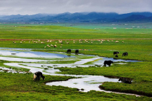 祁連山草原因交融之美,被評(píng)為“中國(guó)最美的六大草原”之一,具有面積大、草質(zhì)好、類型多、產(chǎn)草量高等特點(diǎn),有罕見(jiàn)的林中草場(chǎng)。海拔4000以上還有高山積雪形成的碩長(zhǎng)而寬闊的冰川地貌奇麗壯觀。進(jìn)入祁連境內(nèi),放眼望去,滿目盡是草原旖旎的風(fēng)光。夏季的草原像是廣袤無(wú)垠的綠毯,滿山的白藏羊恰似散落的珍珠,黑色的牛毛帳篷、裊裊升起的炊煙、牧人悠揚(yáng)的歌聲,這一幕如畫風(fēng)景卻是草原最尋常的景色。