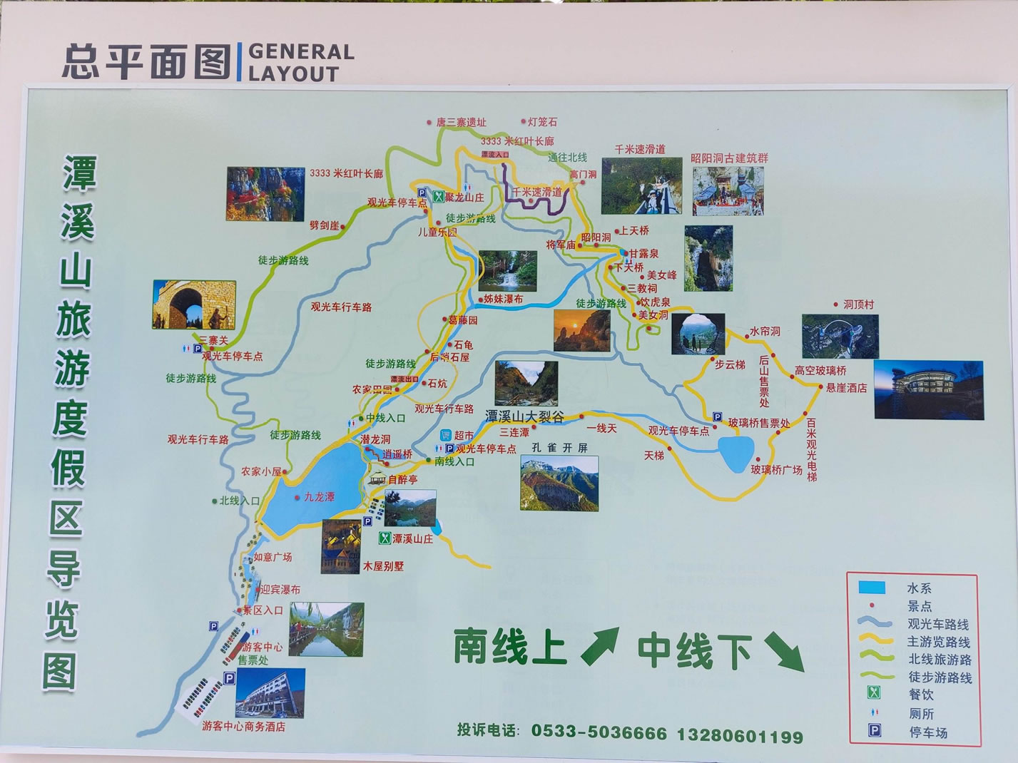 旅游中線:全程約1小時(shí),以農(nóng)家風(fēng)光、休閑娛樂為特色,主要景點(diǎn)有:潭溪山大瀑布、如意廣場(chǎng)、九龍?zhí)丁⑻断角f、自醉亭、潛龍洞、逍遙橋、潭溪山古酒坊、農(nóng)家田園、后哨石屋、櫻桃峪、神龜探路、姊妹瀑布、兒童撒野樂園、乘觀光車下山。 |