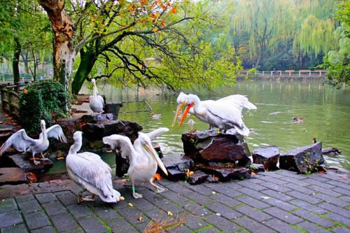 上海動(dòng)物園天鵝湖建于1954年,面積近3.3公頃(近50畝),是由幾個(gè)天然水塘開挖連成的,因首先飼養(yǎng)天鵝而得名,一座三孔橋南北橫跨。湖東一座琉璃綠瓦的四角亭,與西面鴛鴦榭遙遙相對(duì),臨水倚欄,觀賞水禽、飛鳥,尤其每天鵜鶘在上空盤旋,令人迷離神往。