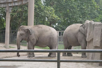 上海動(dòng)物園飼養(yǎng)有國內(nèi)動(dòng)物園少有的三代同堂的亞洲象家族。象展區(qū)包括象宮和象室外活動(dòng)場(chǎng)兩部分。象宮建成于1955年,是上海動(dòng)物園第一幢永久性的動(dòng)物館舍,總建筑面積1550平方米,主要包括500平方米室內(nèi)活動(dòng)場(chǎng)、620平方米參觀廳和100余平方米的4個(gè)門廳。室內(nèi)活動(dòng)場(chǎng)的東、西、南三面都是寬9米的參觀廳,參觀廳進(jìn)出口的門廳東、西各有一個(gè),南面分左右二個(gè),南面二門廳間外有紫藤棚架相連。整個(gè)建筑的門窗都用杉木拼雕成具有民族風(fēng)格的圖形裝飾。