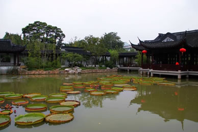 沿戲鵝池往東走,戲鵝池的北面是一三面臨水船型建筑,為石舫,又名不系舟,建于明代。原為園主的書畫舫,前艙后樓,花窗曲檻,艄樓高聳,有祝允明題額"不系舟"三字。后遭毀壞,由清代名醫(yī)和鴻舫重題,舟上有清末進士廖壽豐撰書的一副對聯(lián):“十分春水比檐影;百葉蓮花七里香!