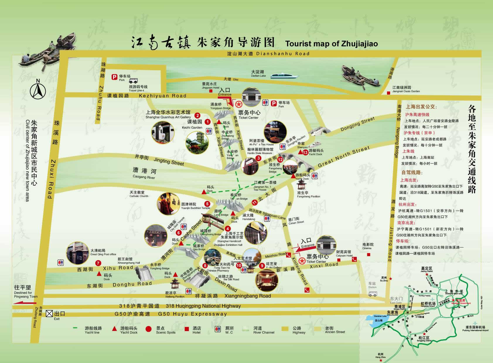 朱家角古鎮(zhèn)旅游區(qū)地處江、浙、滬二省一市交通要樞,地理位置十分優(yōu)越,東靠虹橋國(guó)際機(jī)場(chǎng),北連昆山,南接嘉興,西通平望,淀山湖下游、黃金水道漕港河穿鎮(zhèn)而過(guò)。鎮(zhèn)內(nèi)河港縱橫,九條長(zhǎng)街沿河而伸,千棟明清建筑依水而立,36座石橋古風(fēng)猶存,名勝古跡比比皆是。在玩膩了一個(gè)個(gè)雷同價(jià)高的人造景觀后,人們莫不驚訝于上海市郊還有一塊保存得如此完好的原汁原味、真山真水的天然景觀,在這里可以尋找一種回歸自然,崇尚野趣的享受。無(wú)怪乎一位同濟(jì)大學(xué)的名教授在考察朱家角古鎮(zhèn)旅游區(qū)后,不覺(jué)贊嘆:“朱家角古鎮(zhèn)旅游區(qū)有這么豐富的文化遺產(chǎn),不僅是上海一寶,也是國(guó)家的瑰寶”。臺(tái)灣著名已故作家三毛,到此曾為“小橋、流水、人家”的格局而迷戀,為清淳幽靜,處處可畫(huà)、時(shí)時(shí)有詩(shī)的風(fēng)情而陶醉。中共中央政治局委員、國(guó)務(wù)院副總理吳邦國(guó)在視察了古鎮(zhèn)朱家角古鎮(zhèn)旅游區(qū)后,不禁欣然命筆,寫(xiě)下了“全國(guó)歷史名鎮(zhèn)朱家角古鎮(zhèn)旅游區(qū)”幾個(gè)大字。