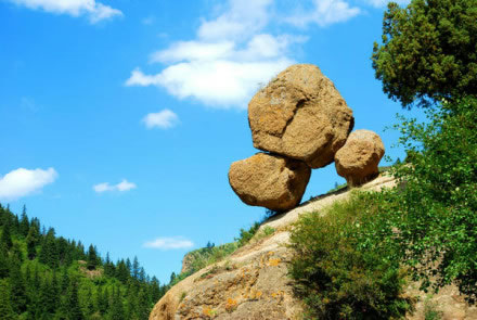 寧武縣城30公里處的東寨鎮(zhèn)西樓子山南麓半坡,有一座峭巖矗立于溝側(cè)溪畔。這峭巖高約兩丈余,頂部巍巍托起一塊巨大奇石。這奇石以兩塊小石作支腳,立于約三四十度的峭巖斜坡頂部。奇石高約3米,闊約2米。雖立斜坡,風吹似動,但數(shù)干百年來,它卻一直屹立在那里。由于奇石狀似加蓋的鍋,支撐它的兩小石形若鍋腳,故而人稱“支鍋奇石”,成為古寧武府和寧武縣八大奇景之一。據(jù)關(guān)專家考察,該奇石形成于第四紀冰川期。