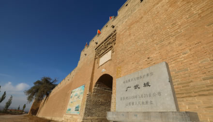 廣武古城分東、西、南三門,不設(shè)北門,街巷格局方正。坐落在山陰縣西南、雁門關(guān)外古長城腳下。隸屬于山西省朔州市山陰縣張家莊鄉(xiāng)舊廣武村。